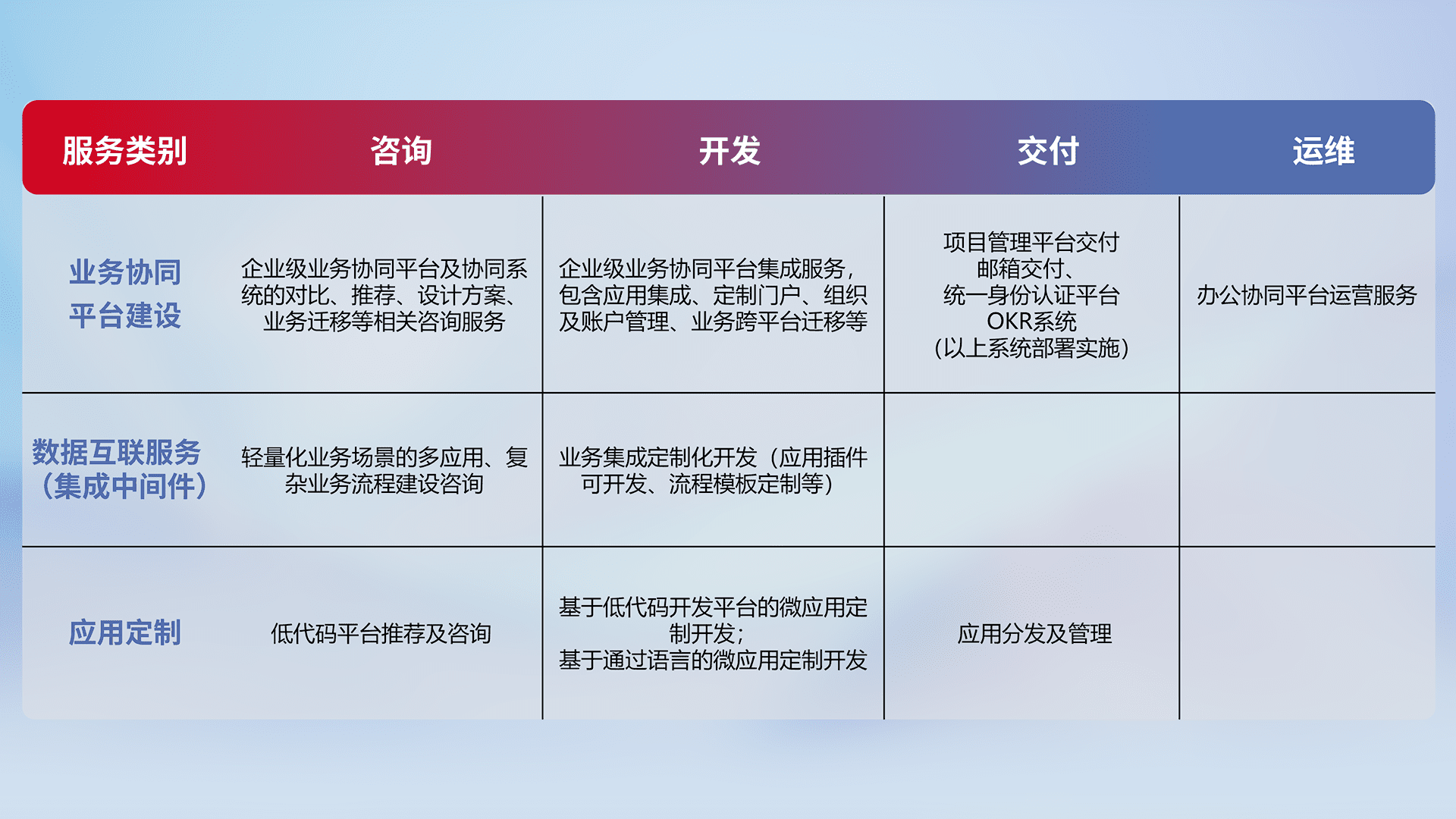 针对钉钉、、企微、、、、IDaas等平台级产品提供产品的规划、、、方案、、、交付、、、、定制化开发等服务,,实现如统一协同办公、、、智能客户服务、、、混合会议管理、、、、智能数据查询、、、等业务场景,,,实现数字化转型。。。